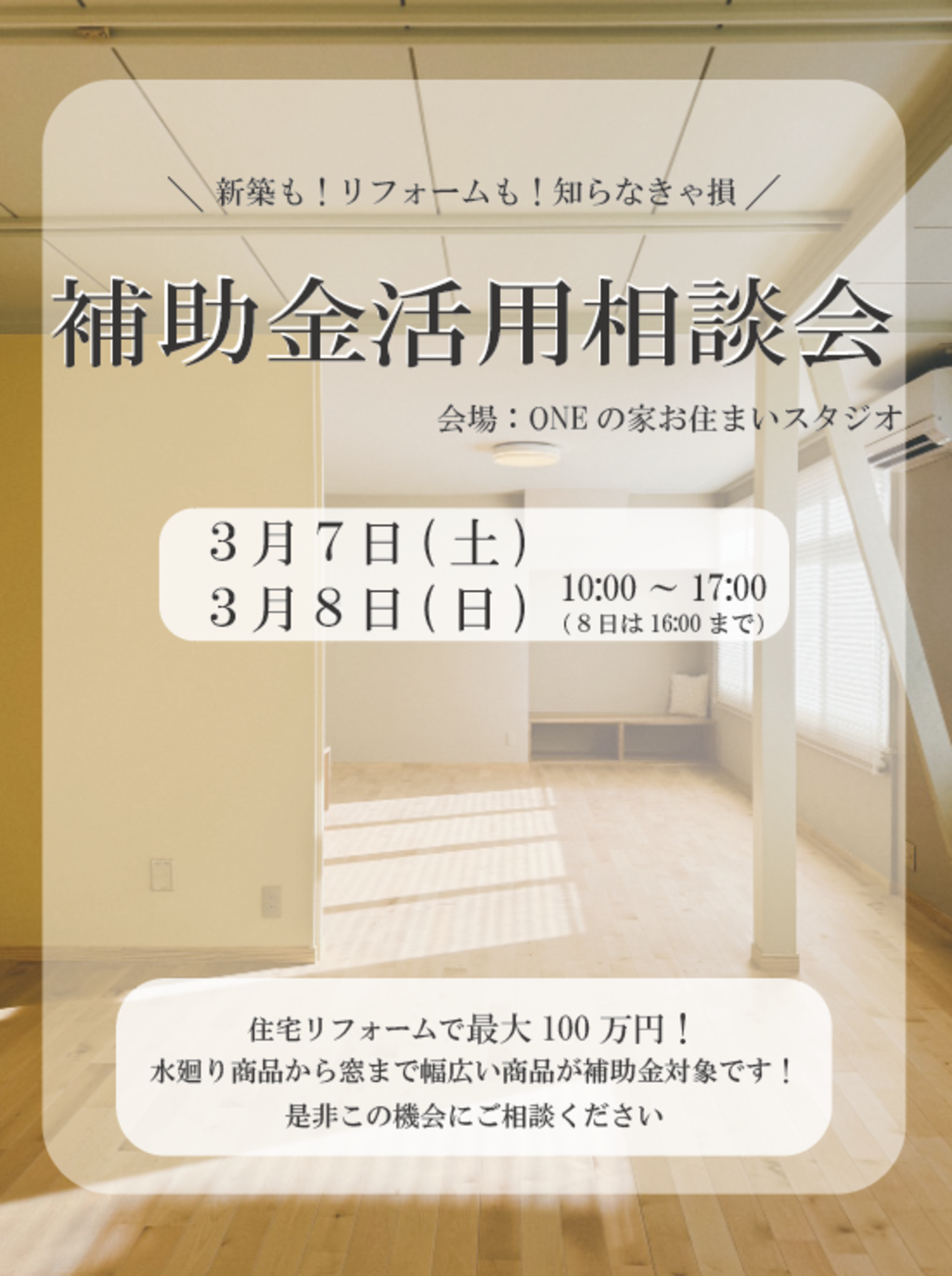 | 開催場所 | リフォームワン「ONEの家お住まいスタジオ」 |